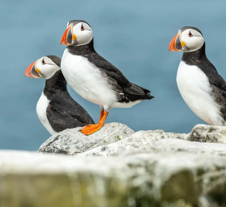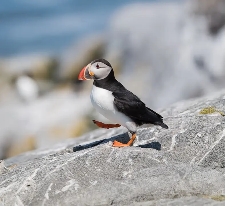 Puffins inhabit Arctic fjords, developing their striking red beak during the summer months as a mating lure. Skilled swimmers, Puffins can dive up to 60 meters underwater in search of prey and fly at up to 88 kilometres an hour. Other species that thrive in the glacial ice include Arctic Tern, Ivory Gull, the King Eider, and Long-tailed Duck.